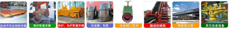 公司产品有ZT系列铁水罐车、钢包车、渣罐车、渣盘车、电动平车、过跨车、铁水称量车、液压倾翻车、废钢料篮车、中间罐车、修炉车、炉底车、镍铁矿热炉料罐车、汽运铁水车以及各种铁水罐(包)、钢水包(罐)、渣罐、渣盘、中间罐、钢包加盖、龙门吊钩、钢包倾翻机、钢包回转台等产品。